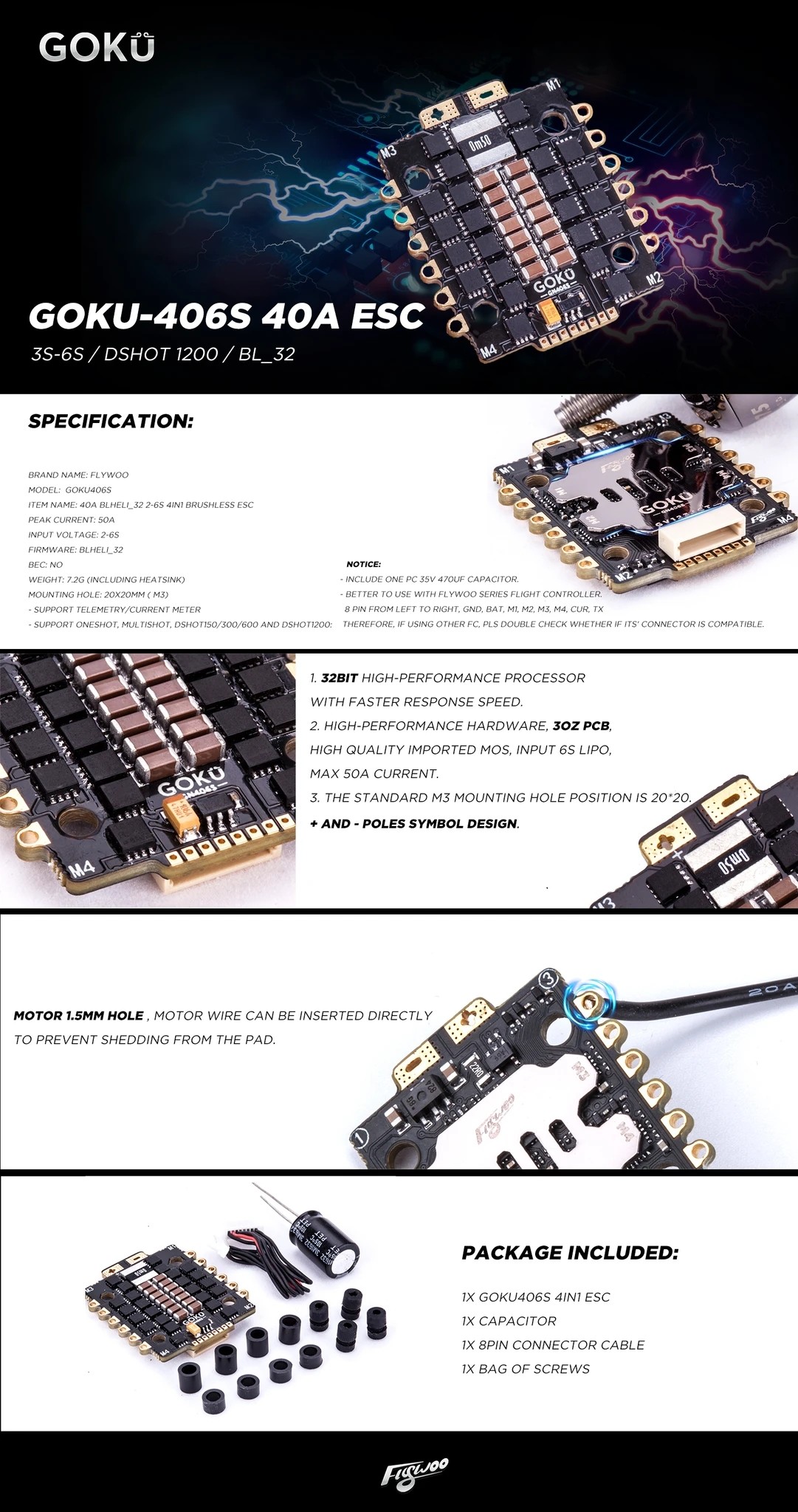 FLYWOO GOKU 406S 40A BLheli_32 2-6S 4in1 Brushless ESC